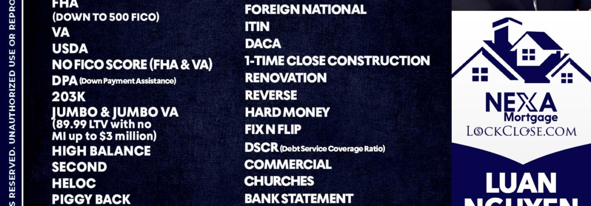 I SHOP +260 - Luan Nguyen -Loan OfficerHi, my name is Luan Nguyen. I’m a Loan Officer with NEXA Mortgage LLC., offering personalized mortgage solutions, fast customized quotes, great rates and service with integrity.