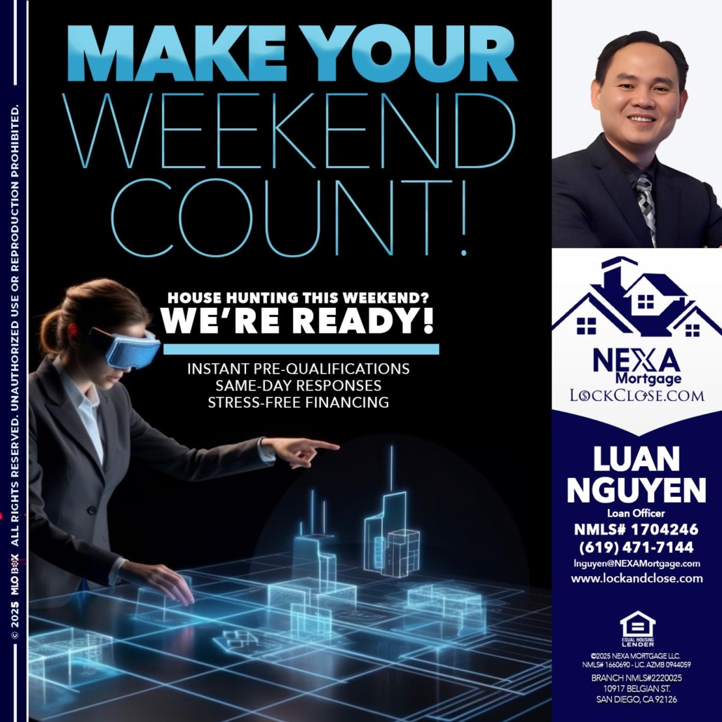 Hi, my name is Luan Nguyen. I’m a Loan Officer with NEXA Mortgage LLC., offering personalized mortgage solutions, fast customized quotes, great rates and service with integrity.