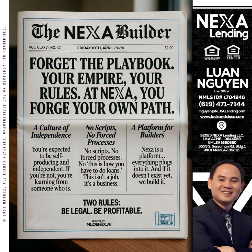 Hi, my name is Luan Nguyen. I’m a Loan Officer with NEXA Lending LLC., offering personalized mortgage solutions, fast customized quotes, great rates and service with integrity.